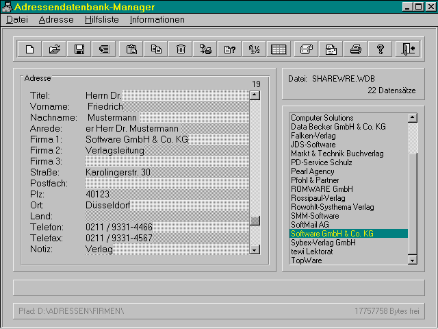 - Verwaltung von bis zu 20000 Adressen / Datensätzen pro Datenbank-Datei