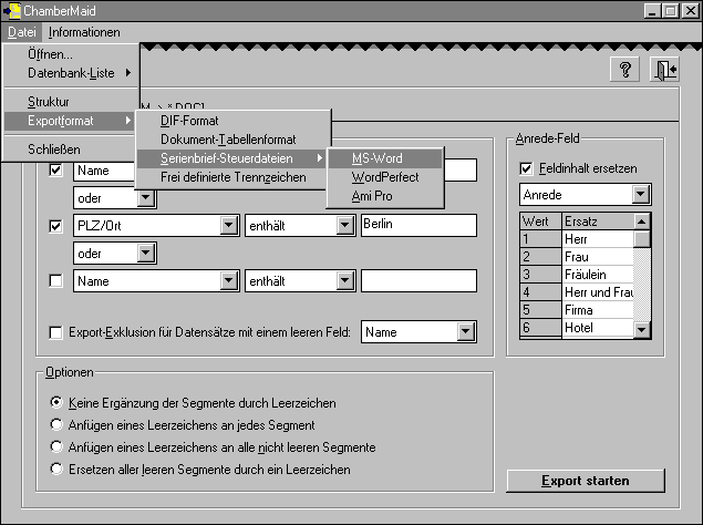 - Export als Serienbrief-Steuerdateien (MS-Word, WordPerfect, Ami Pro), Dokument-Tabellen- und DIF-Dateien (MS-Excel, Lotus 1-2-3)